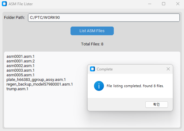 - 파일 목록 표시: 선택한 폴더 내에서 .asm, .prt, .drw 확장자를 가진 파일들을 자동으로 찾아 'File list' 텍스트 상자에 목록으로 보여줍니다.