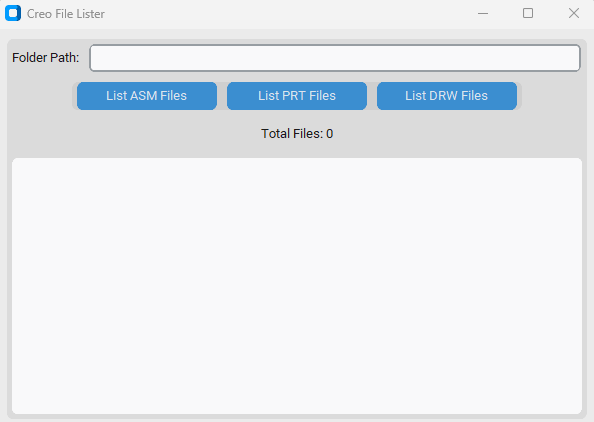 - 폴더 선택: "List ASM Files", "List PRT Files", "List DRW Files" 버튼을 누르면 파일 대화 상자가 나타나 원하는 폴더를 선택할 수 있습니다.